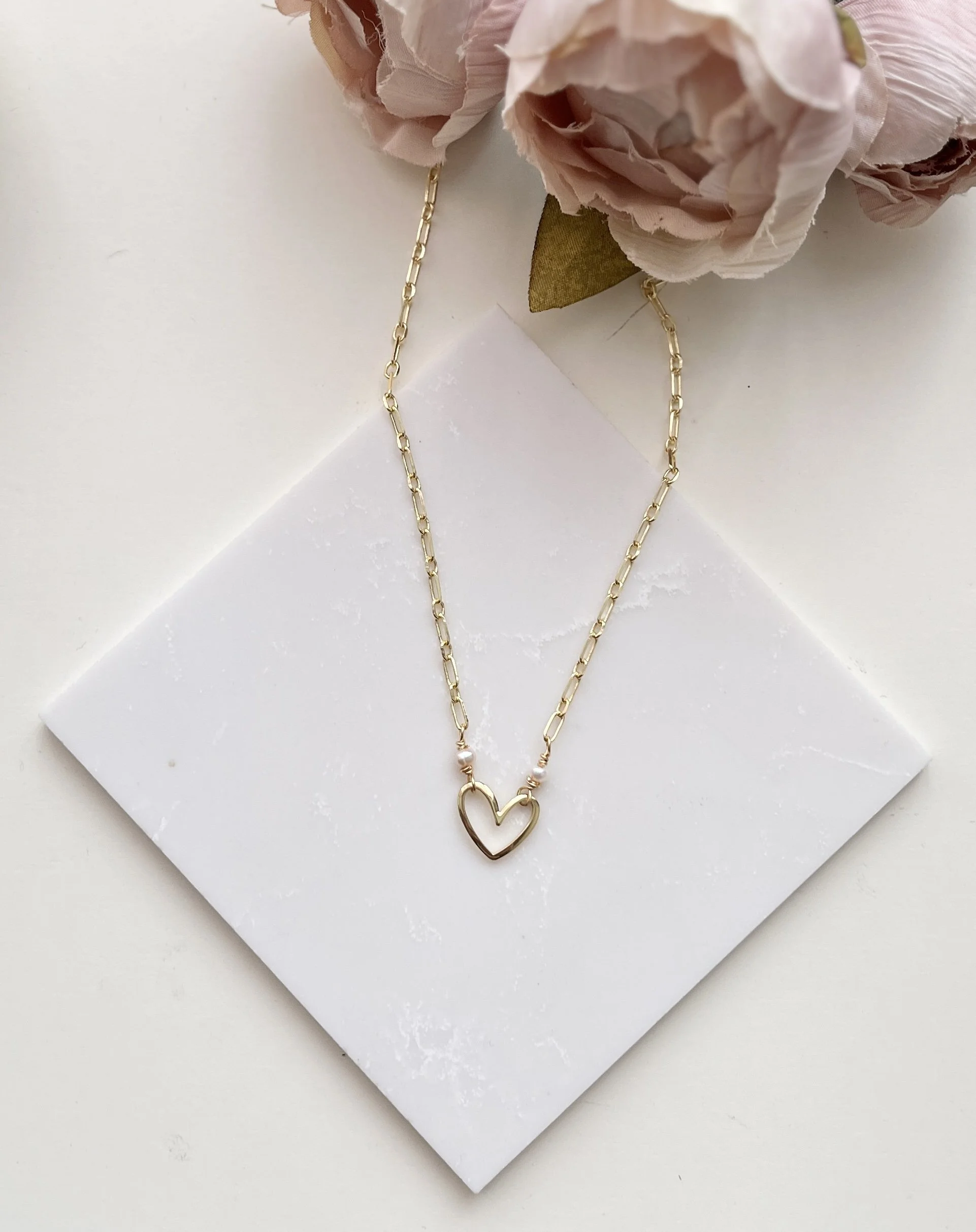Habibi Heart & Pearls Necklace $60.00 Gold filled heart charm and two freshwater pearls on 16k gold plated chain. Length:18” Shop › Habibi Heart & Pearls Necklace Quantity: Add To Cart Added! Gold filled heart charm and two freshwater pearls on 16k gold plated chain. Length:18”